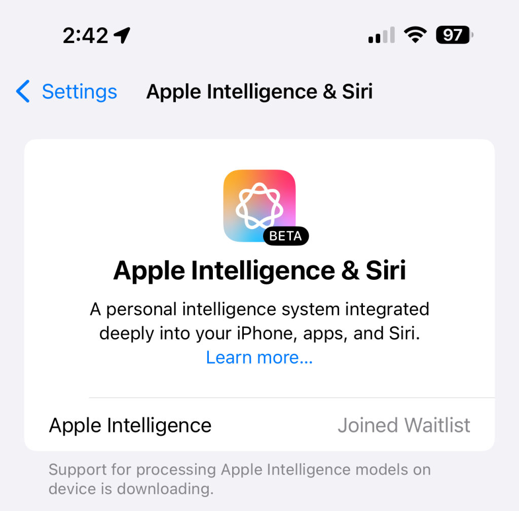 Directly under the Apple Intelligence & Siri graphic and header text, you should see an option to Join Waitlist (this may take a minute or two). Tap that, and it will change to Joined Waitlist.