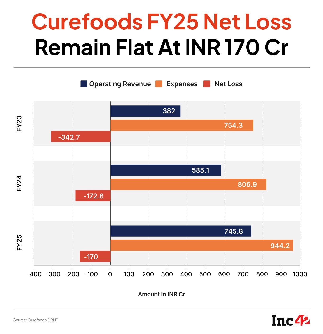 The loss saw only a marginal decline despite a healthy rise in the company’s top line. Curefoods reported an operating revenue of INR 745.8 Cr in FY25, up 27.4% from INR 585.1 Cr in the previous fiscal year, as per its DRHP filed with SEBI.