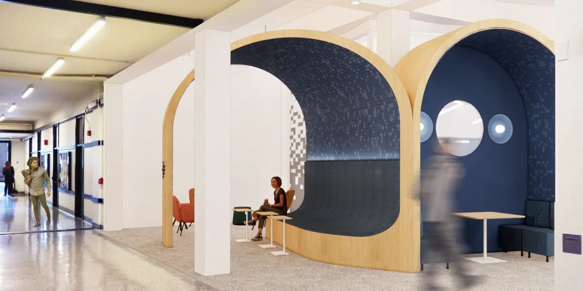 Take a stroll along the Infinite Corridor these days and you’ll encounter a striking new space, in a prominent location on the first floor of Building 11. With bright blue seating modules, orange accents, and an eye-catching design, it looks like a futuristic space station, sleek and ultramodern—but also welcoming and fun.
