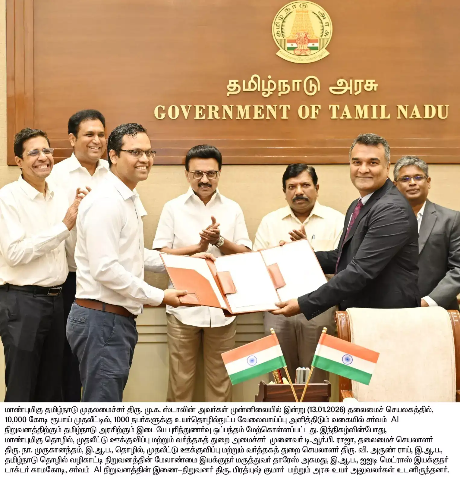 The Tamil Nadu government on Tuesday said it has signed an agreement with Sarvam AI to establish a full-stack Sovereign AI (artificial intelligence) Park.
