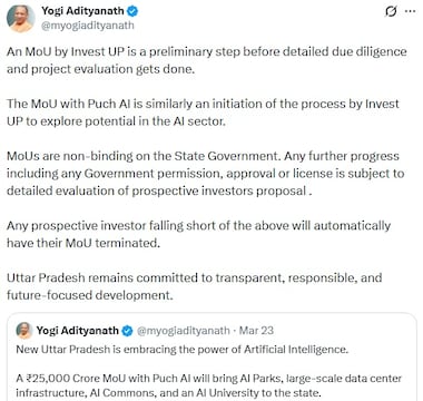 A day after announcing a ₹25,000 crore artificial intelligence partnership, Uttar Pradesh Chief Minister Yogi Adityanath on Tuesday, March 24, moved to recalibrate expectations, clarifying that the agreement with Puch AI is only a memorandum of understanding and not a final investment.
