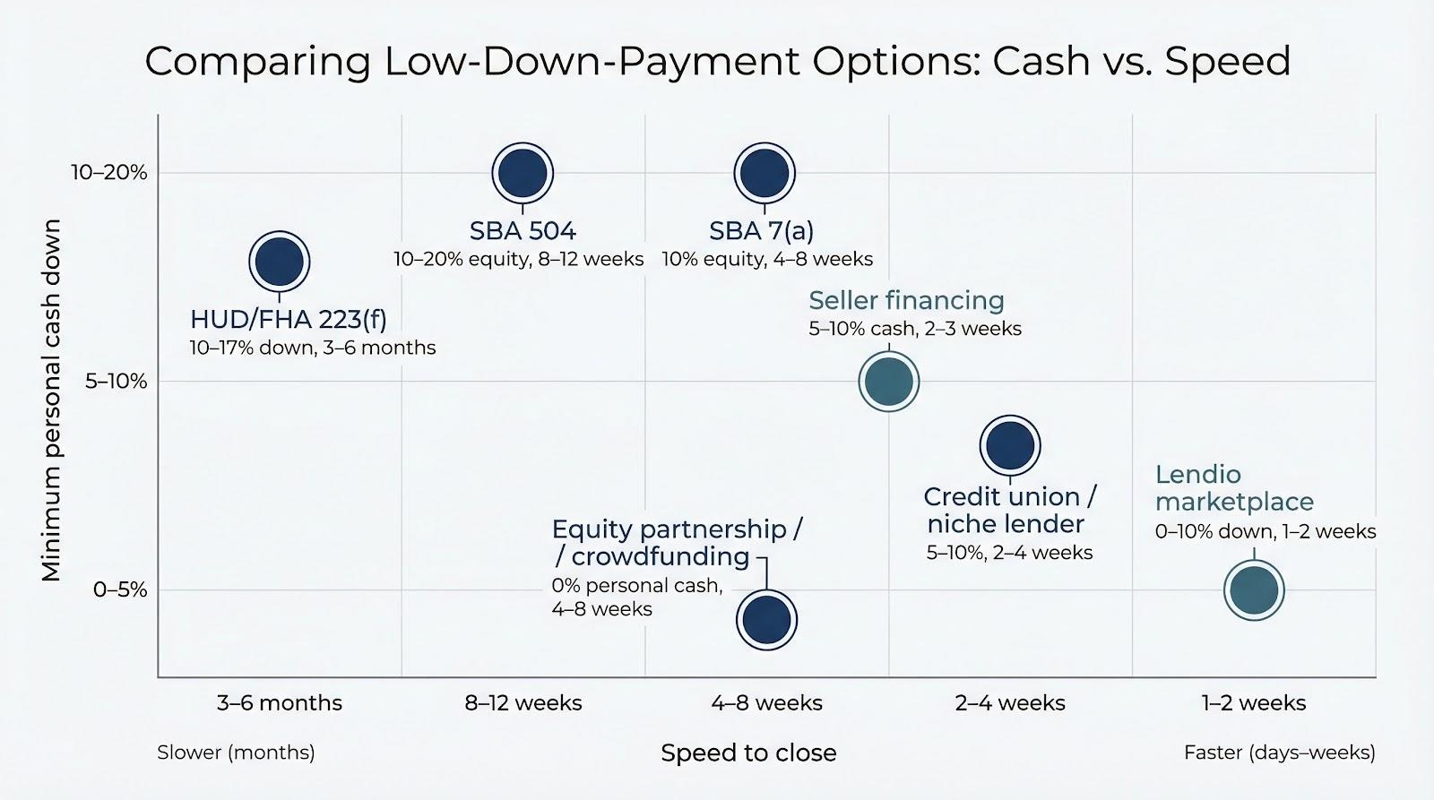 Every path in this guide trades a different resource for lower upfront cash. SBA 7(a) and 504 loans offer government-backed stability at 10 percent down for owner-occupiers, while HUD 223(f) stretches equity furthest on stabilized apartments. When speed or flexibility matters more than federal guarantees, Lendio’s marketplace, credit-union relationships, seller financing, and equity partnerships each fill the gap. Line up your timeline, coverage ratio, and risk tolerance side by side, confirm current terms with each lender, and move before rising rents outpace the closing calendar.