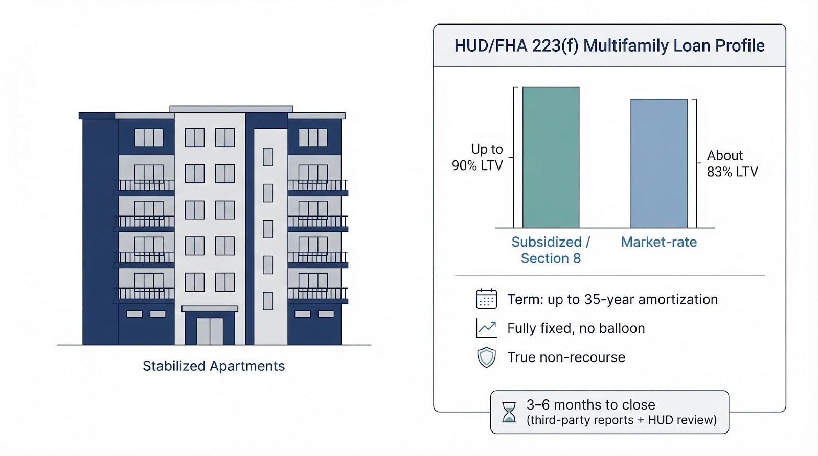 | HUD/FHA 223(f) | 10 percent subsidized, 17 percent market rate | Fully fixed, mid-5 percent range | Up to 35-year amortization, no balloon | Non-recourse | Multifamily investors, long-term hold | 3–6 months |