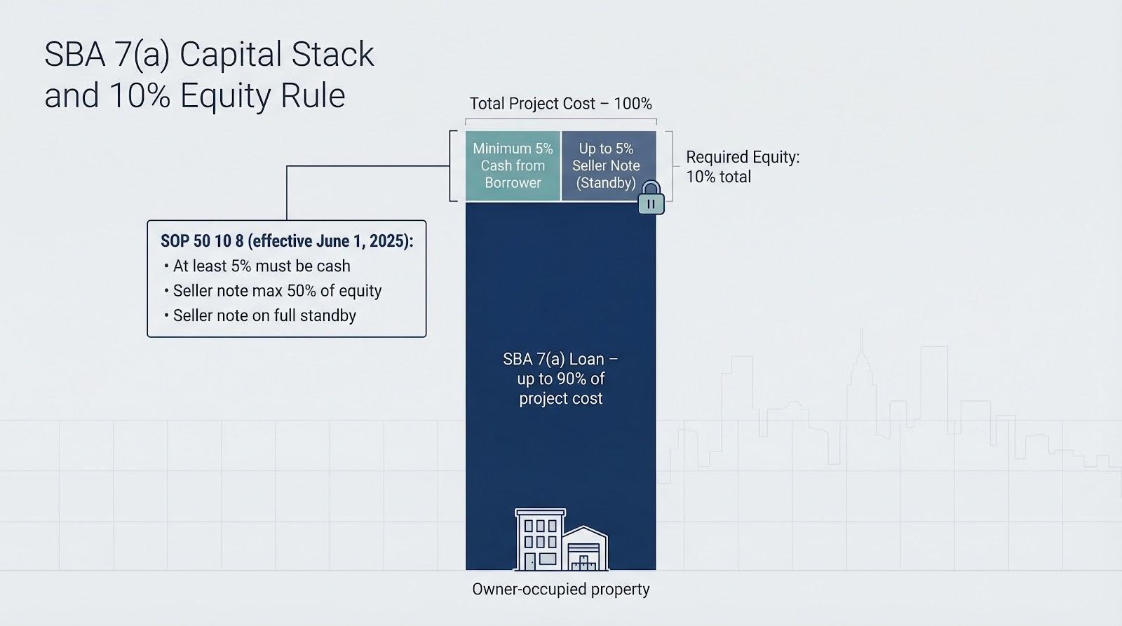 No. SOP 50 10 8, effective June 1, 2025, sets the equity floor at ten percent and limits how much may come from a standby seller note. Files that ignore the rule get declined.