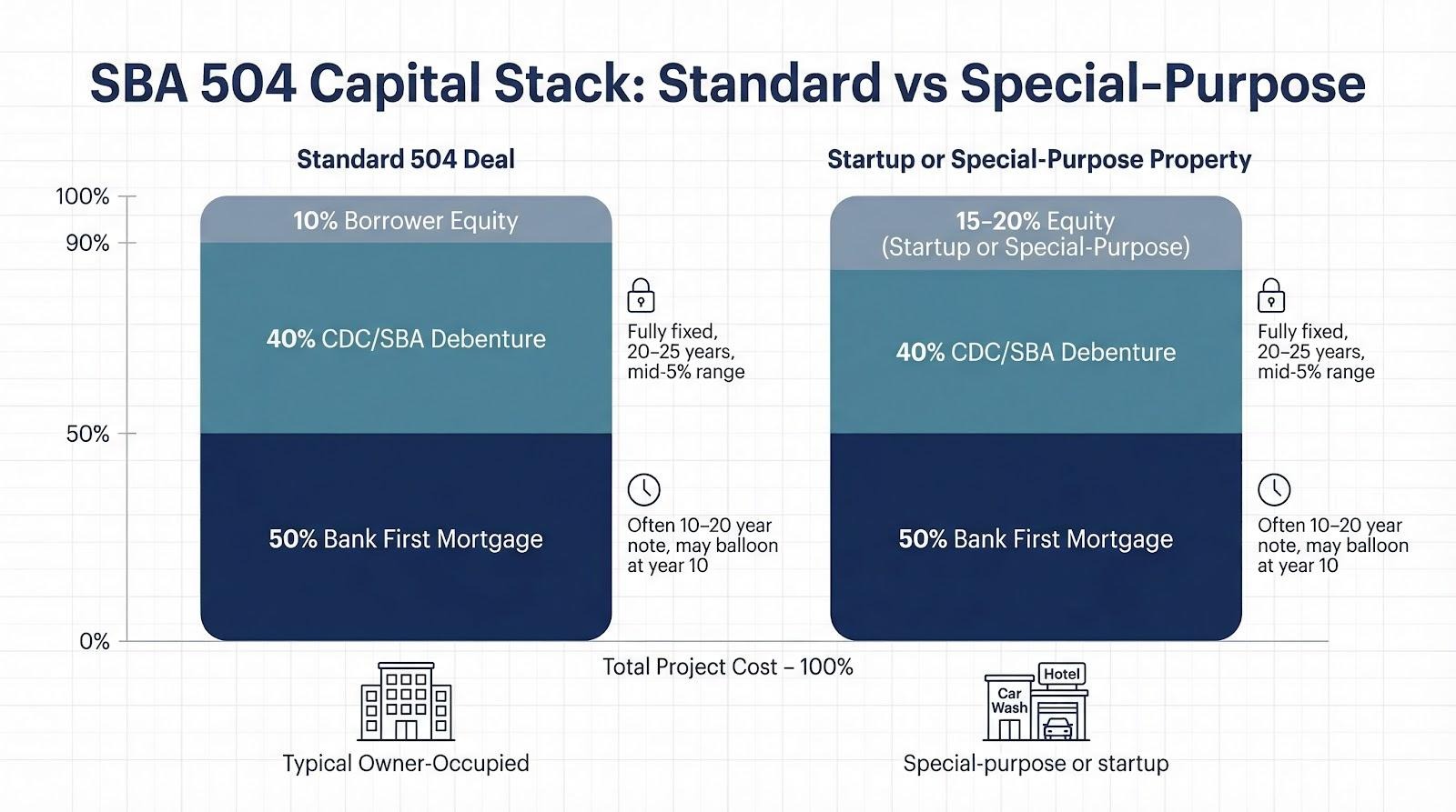 A typical 504 stack looks like this: 50 percent first mortgage from your bank, 40 percent SBA-backed debenture via a Certified Development Company (CDC), and 10 percent borrower equity. According to Legal Clarity, your cash rises to 15–20 percent for startups (< 2 years) or special-purpose properties such as hotels or car washes.