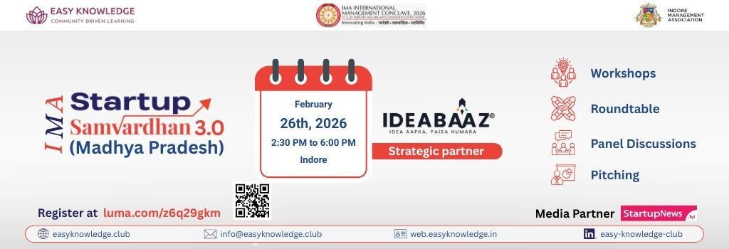 Startup Samvardhan 3.0 is a flagship initiative by Easy Knowledge Club, in collaboration with the Indore Management Association (IMA), aimed at strengthening and nurturing the startup ecosystem across India.